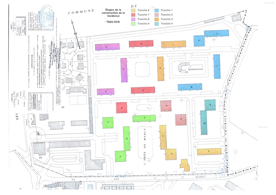 Construite sur un terrain d'environ 9 ha entre 1965 et 1970, ravalée en 2004, la résidence compte 23 immeubles de 3 étages, 1 immeuble de plain-pieds et une chaufferie, 51 cages d'escaliers (donc d'ascenseurs), 585 logements allant de 18 à 160 m2, une piscine chauffée et 2 aires de jeux pour les enfants pour environ 1300 habitants.